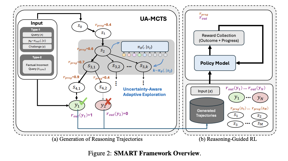 - Smart uses UA-MCTS(Uncertainty-Aware Adaptive Monte Carlo Tree Search) to generate high quality reaoning trajectory