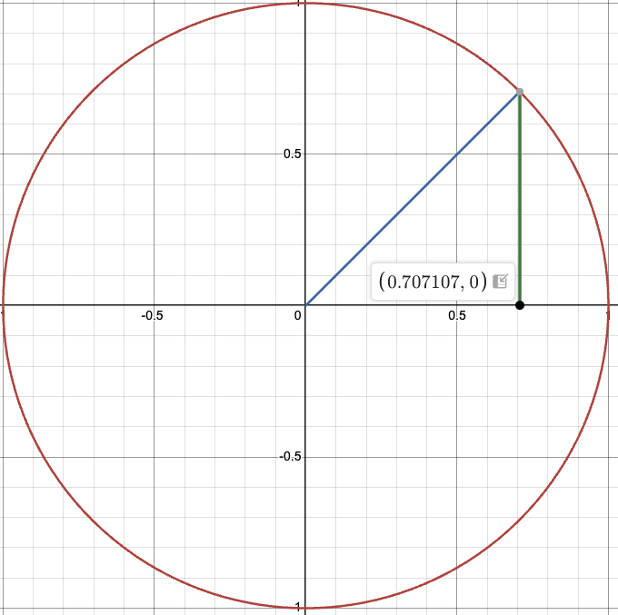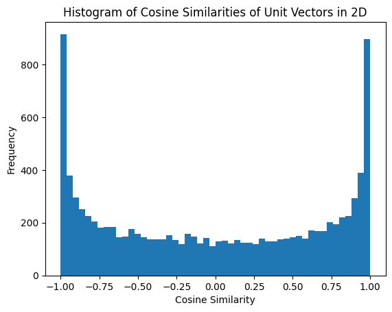 We can fix the first vector to \((1,0)\) without loss of generality. If we look at the first quadrant of the unit circle, we see that \(x = y\) line bisects the circumference of the quadrant. However, the cosine similarity of the midpoint is \(\frac{\sqrt{2}}{2} \approx 0.707\). Since cosine of 90 degrees is 0, and cosine of 0 degrees is 1, we expect to see the same number of points with cosine similarity between 0 and 0.707 and cosine similarity between 0.707 and 1. This explains why we see more points around extreme values.