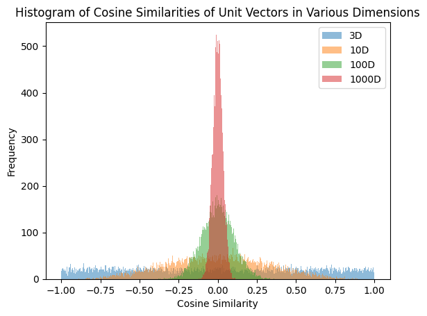 Using this function, I plotted the histogram of cosine similarities in 3D, 10D, 100D, 1000D below.